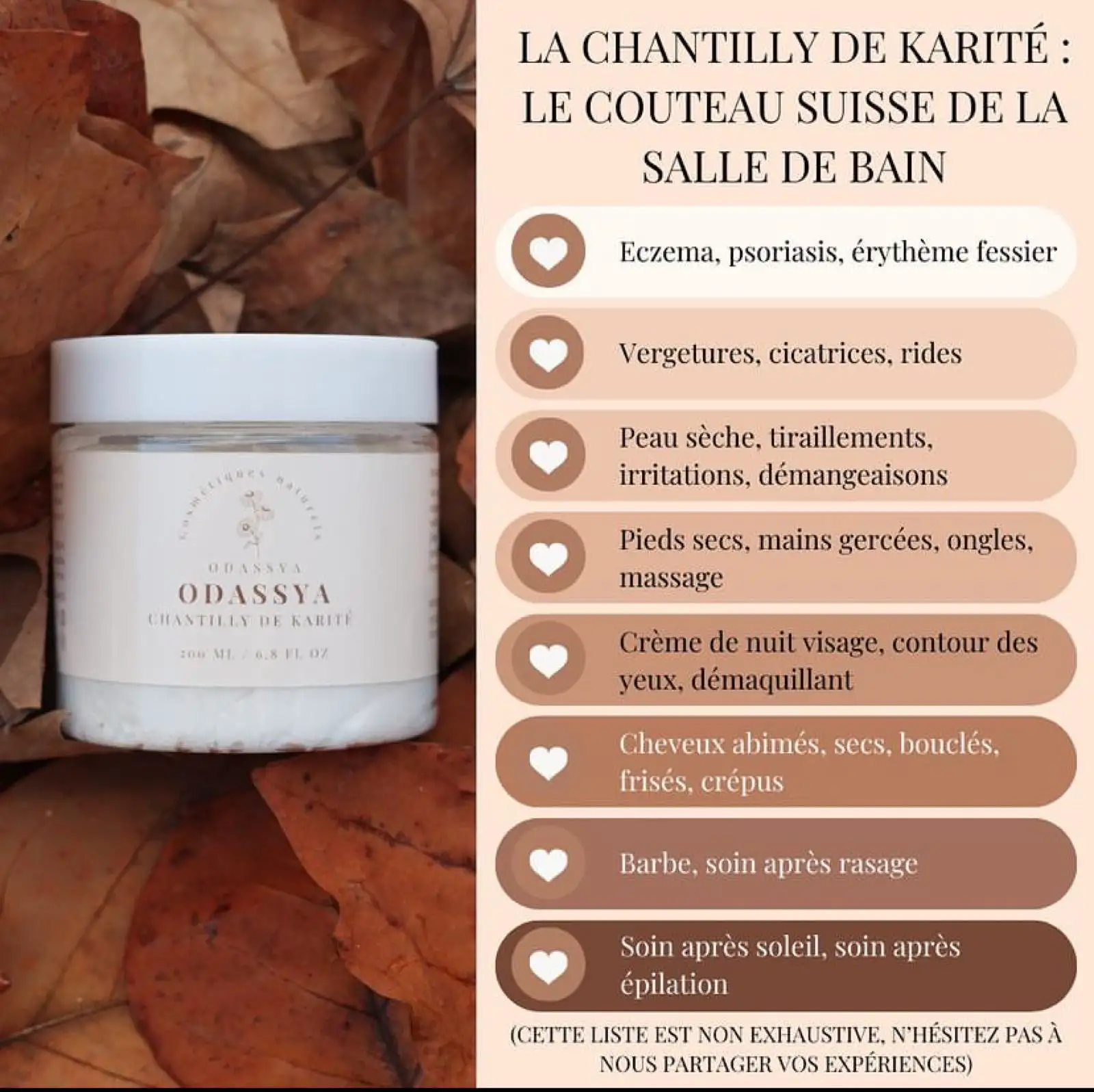 Un baume multifonctions adapté à toute la famille. Notre baume corps, visage, cheveux est composé de beurre de karité et d’huiles d’amande douce, de figue de barbarie, d’argan, de jojoba… Laissez vous tenter par sa texture aérée et sa douce odeur. Pour l’eczéma, les vergetures, les peaux sèches, en crème de nuit ou encore en soin pour les cheveux. C’est un véritable allié à avoir dans sa salle de bain